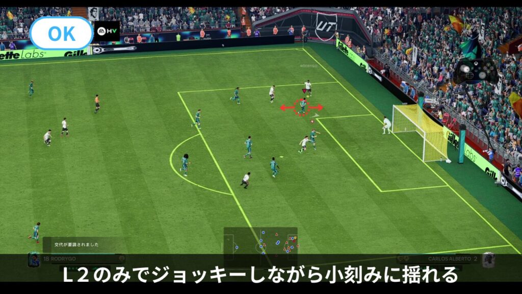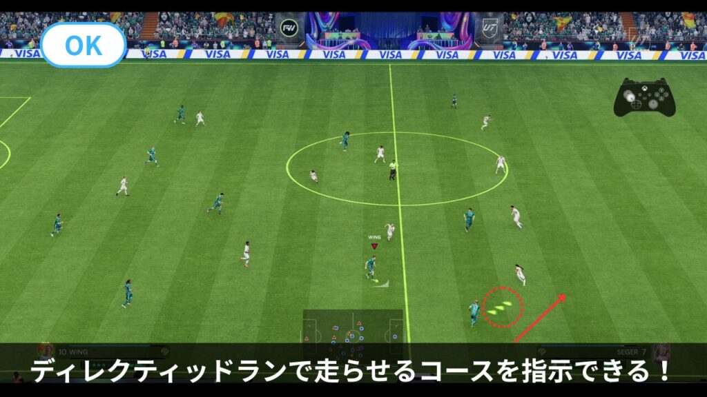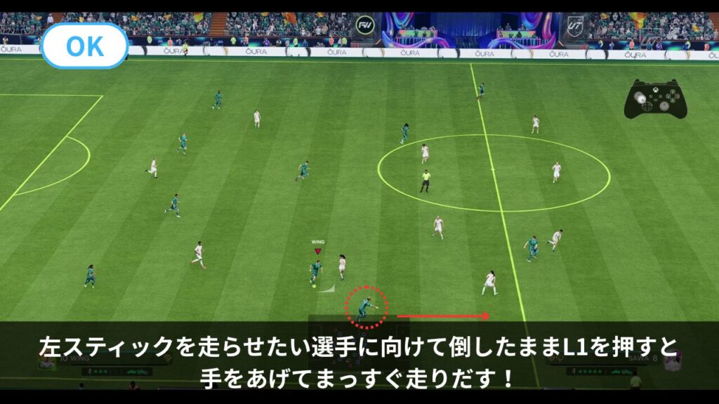 - 左スティックを走らせたい選手に向けて倒し、L1+右スティック(ランコース指示)で「ディレクティッドラン」というものができます。