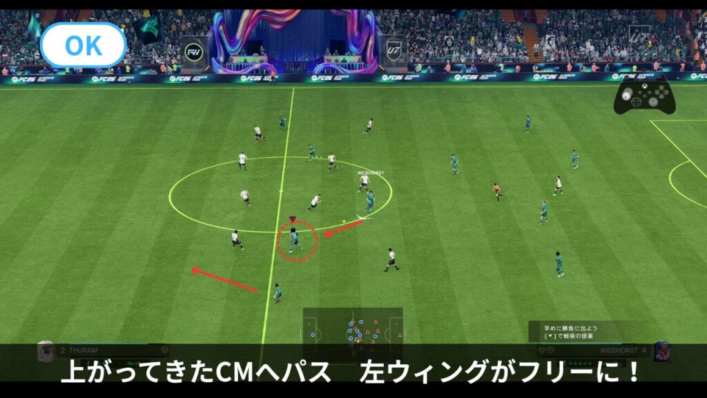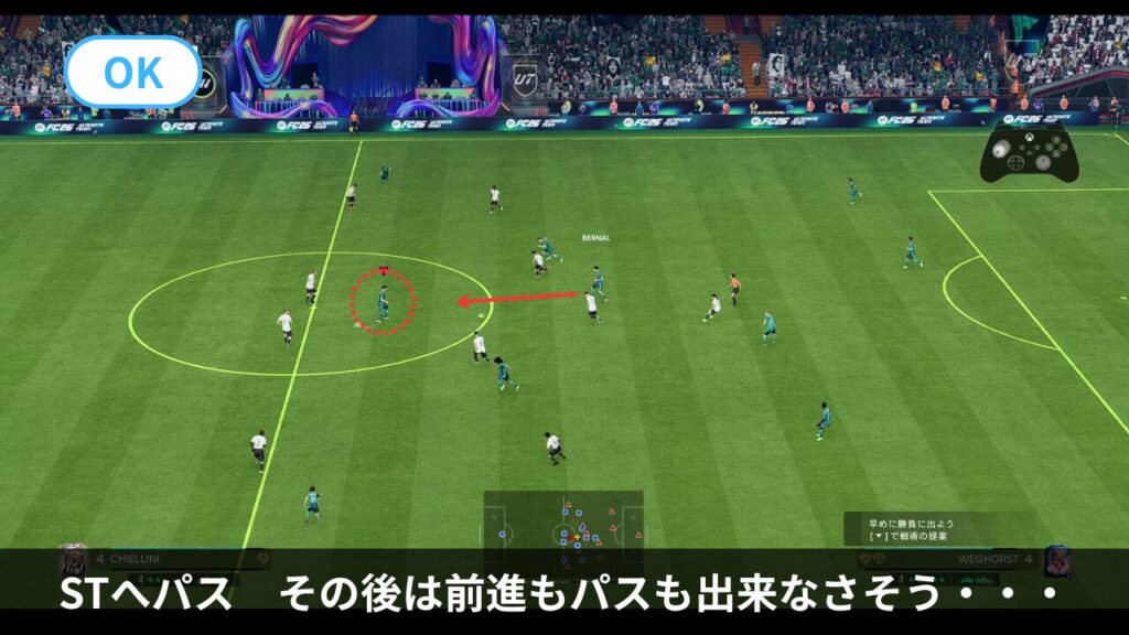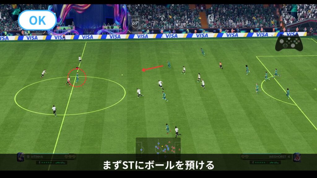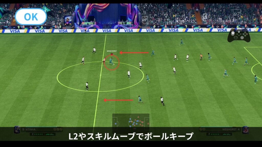 特にSTへパスを出した後、L2ガード(シールド)でタメを作ったり、敵のいない方向へトラップして、フリーの選手が現れるのを待ちます。