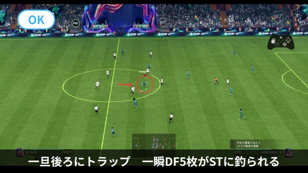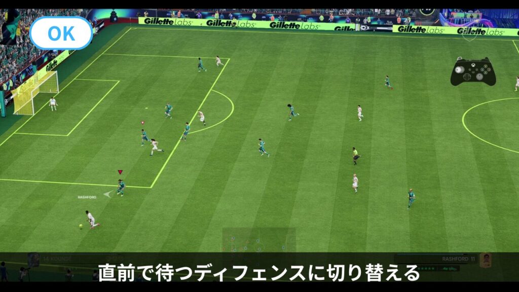 - 裏抜け対策だけでなく、相手が後ろを向いた時やバックパスをした瞬間にもトラップ(十字キー上2回)を使い、押し込まれたラインを押し上げます。