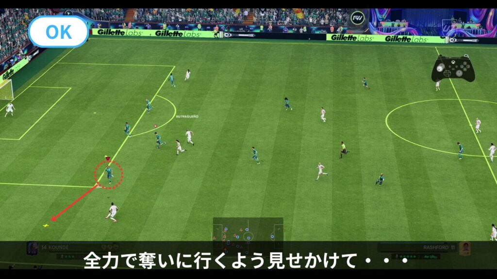 相手はドリブルのコースに迷い、ミスを誘発できます。