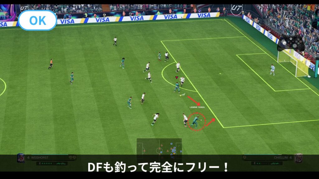 - 味方に「走れ!」と指示を出し続けることで、相手ディフェンスを引き付けます。