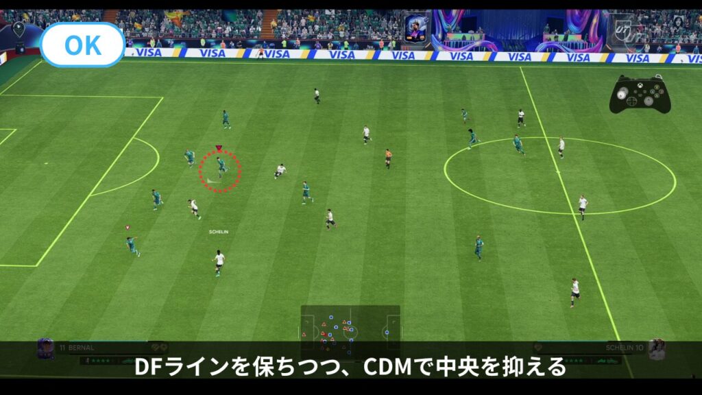 基本はCM・CDMの選手を操作し、バイタルエリア(ペナルティエリア手前)へのパスコースを消し続けます。