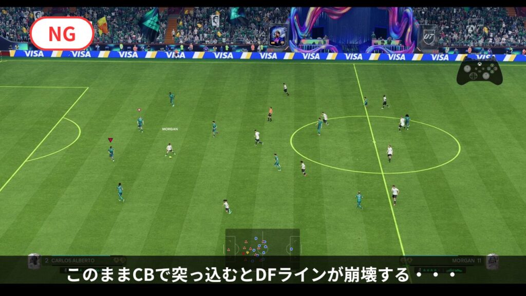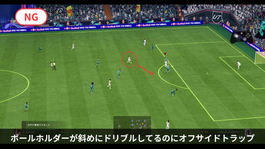 - サイドバック(SB)が抜かれた際、ボールホルダーを必死に追いかけるのはNG。