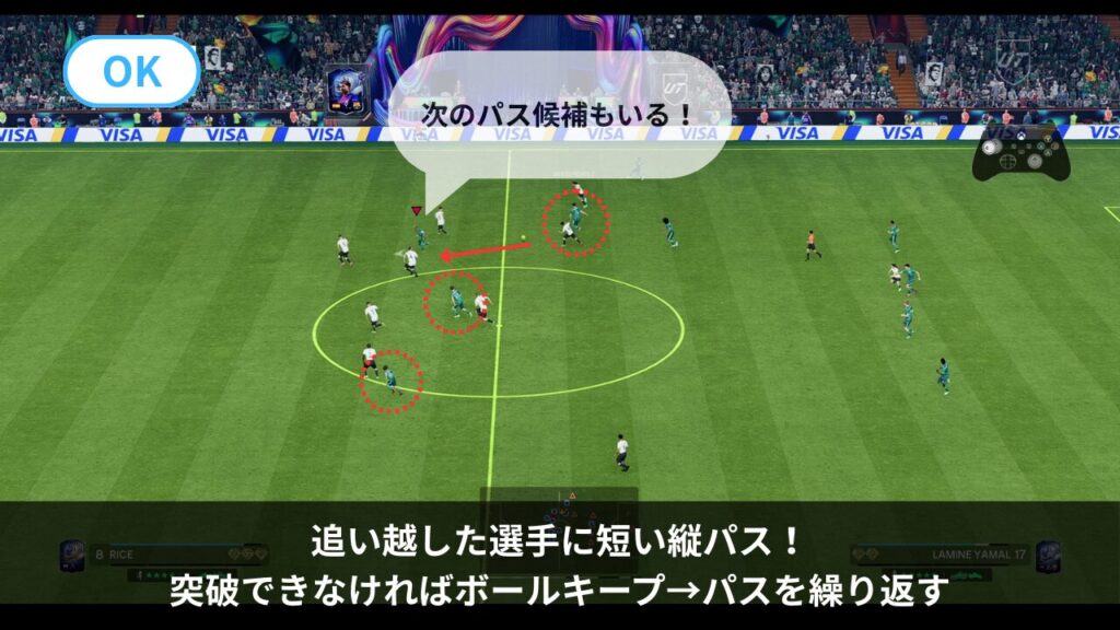 戻すことで相手が食いつき、DFラインに隙間や段差が生まれます。 - ワンツーパスもめちゃくちゃ使えます。